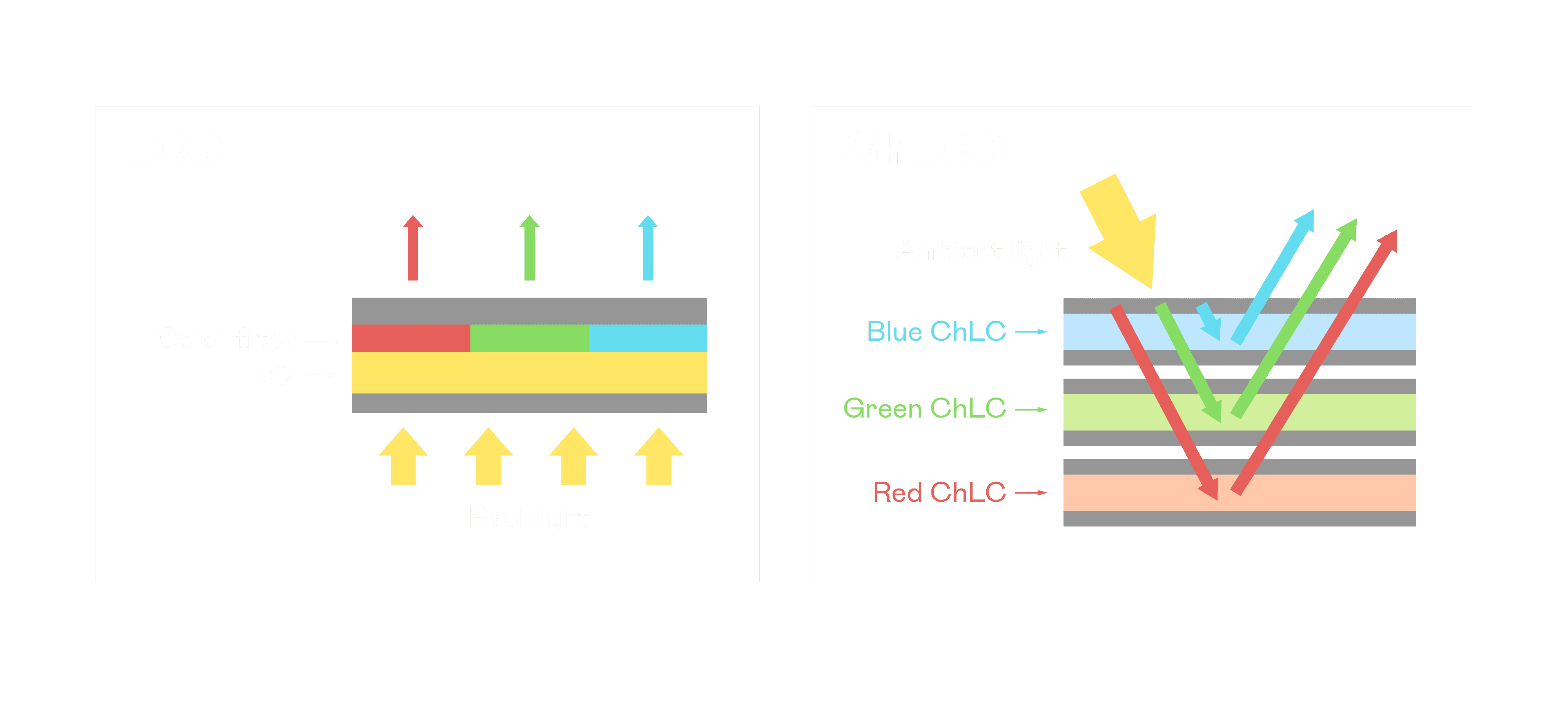 ChLCD 胆固醇液晶就如同纸张一样,,,透过反射环境光来显示影像,,因此长时间观看不易造成人眼视觉疲劳,,,可达到护眼效果。。。。当处于户外阳光下使用,,LCD 影像容易失真而不易观看,,,但胆固醇液晶仍可维持较佳的影像品质。。